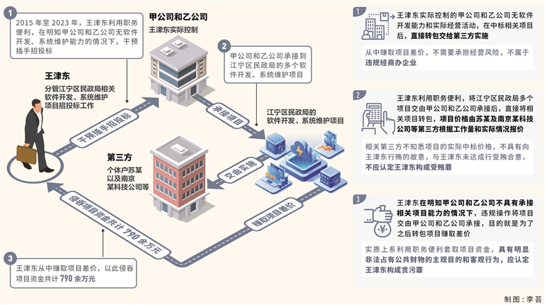 其中,2015年至2023年,王津东利用分管江宁区民政局相关软件开发、系统维护项目招投标工作的职务便利,在明知其实际控制的甲公司和乙公司无软件开发、系统维护能力的情况下,通过干预插手招投标等方式,使甲公司和乙公司承接到江宁区民政局的多个软件开发、系统维护项目,再交由个体户苏某以及南京某科技公司等第三方实施,以此侵吞项目资金共计790余万元。
