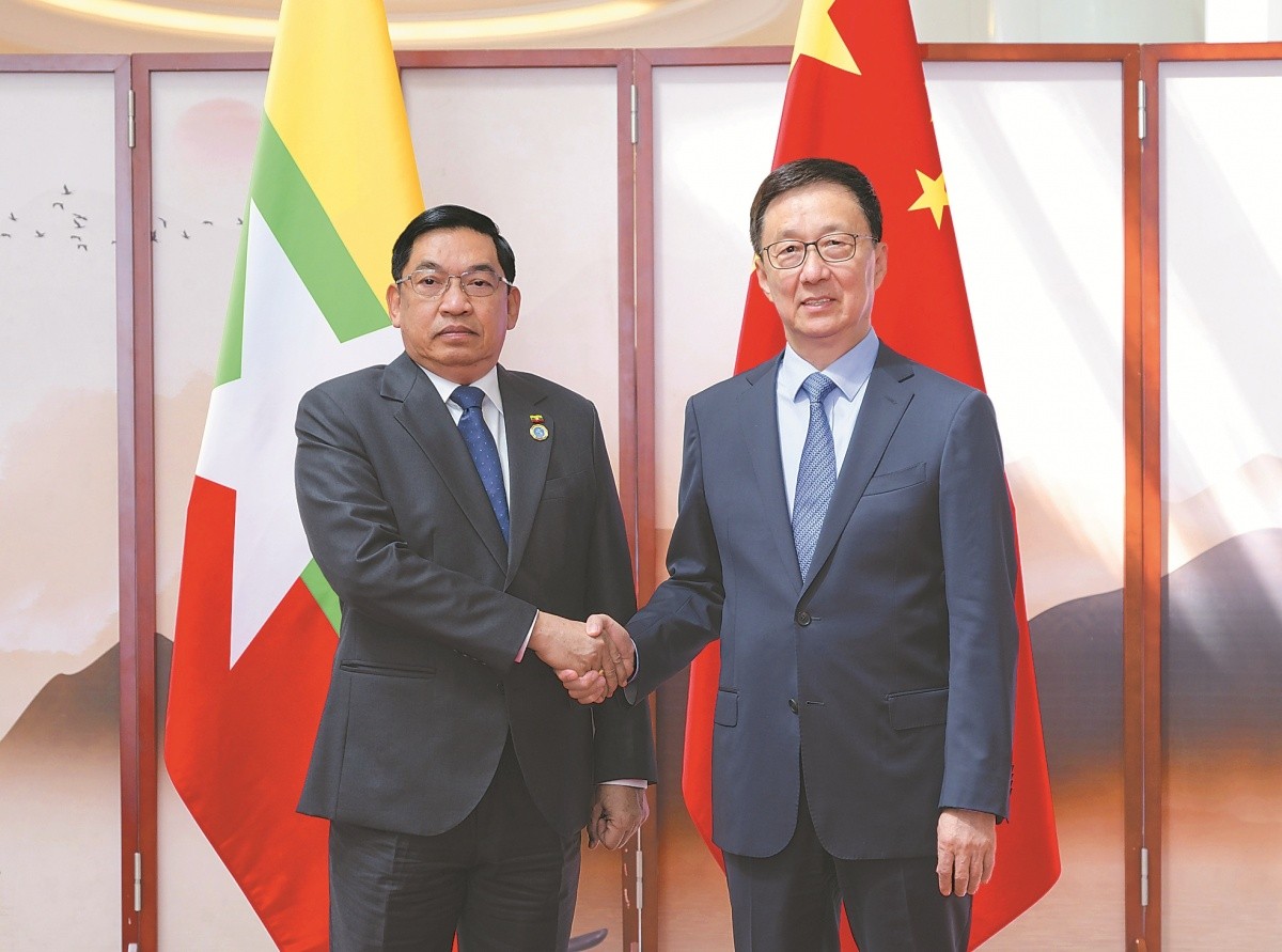 会见纽梭时,韩正表示,今年是中缅建交75周年。不久前,习近平主席同敏昂莱代总统举行了富有成果的会晤,达成重要共识,为两国关系发展指明方向。中方愿同缅方落实上述重要共识,深化中缅命运共同体建设。中方支持缅方维护国家稳定和主权独立,稳妥推进国内政治议程。希望缅方加大打击跨境犯罪,维护好中国在缅人员、机构、项目和中缅边境安全。