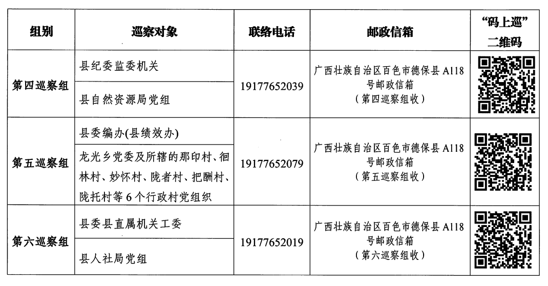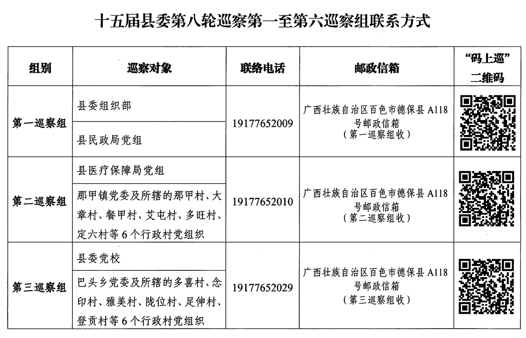 巡察期间,县委各巡察组设置了联络电话、邮政信箱和“码上巡”二维码,受理信访举报电话的时间为工作日上班时间8:00—12:00,15:00—18:00,信访受理截止时间为2026年1月7日。为便于干部群众反映情况,现将县委各巡察组有关联系方式公布如下: